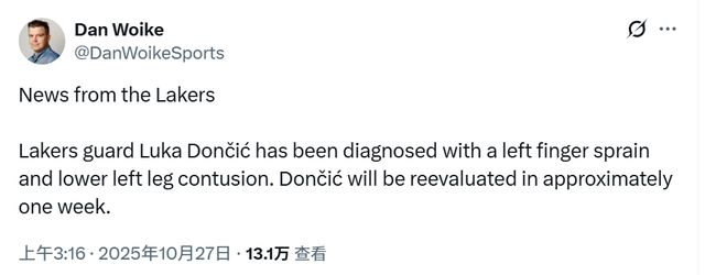北京时间10月27日,湖人官方宣布,东契奇被诊断为左手指扭伤与左小腿挫伤,将至少缺阵一周。詹姆斯已经是伤停状态,对于湖人来说,两大巨星都不能打,将是对阵容深度的重大考验。